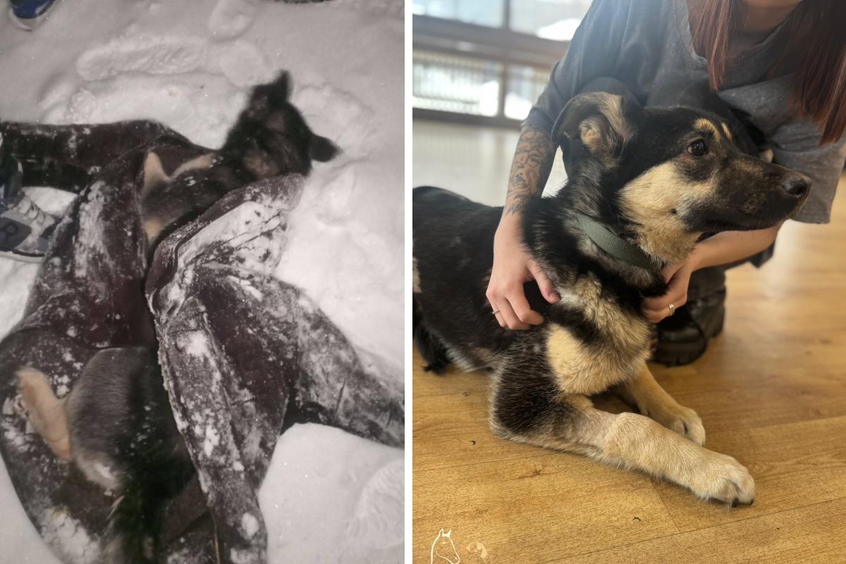 Щенок провёл несколько дней на обочине дороги, засыпанный снегом