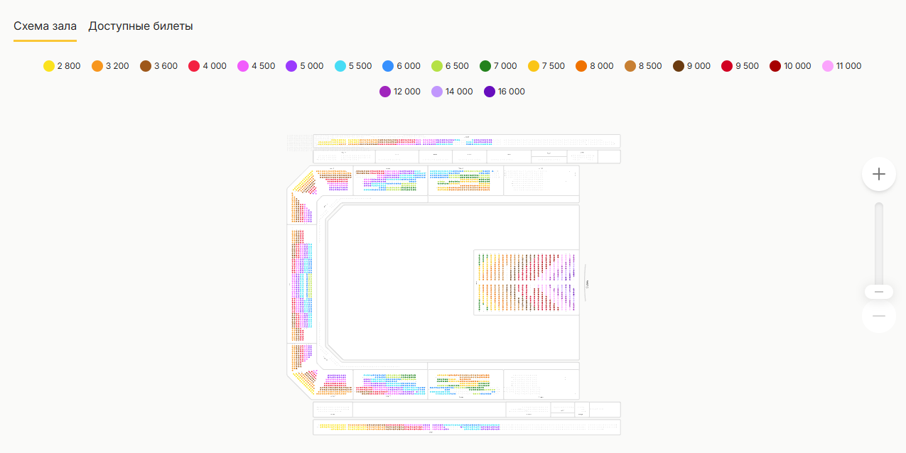 Стоимость билетов начинается от 2800 рублей за места на отдалённых секторах. Цены в партере стартуют от 7000 рублей, а лучшие места у сцены оцениваются в 14 000 и 16 000 рублей.