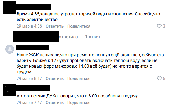 Представители коммунальных служб первоначально обещали восстановить услуги в тот же день, однако этого до сих пор не произошло. «— Сначала время сдвинули до 18:00. Далее до 00:00. Время меняется, только в трубах ничего не появляется, — сообщила женщина из дома на улице Верхне-Печерской, 14.»