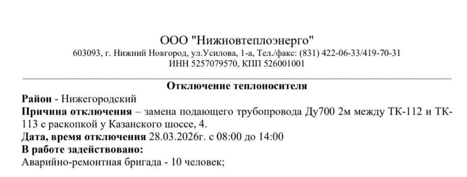 Также стало известно, что во вторник, 31 марта, в некоторых районах Нижнего Новгорода будет отключена холодная вода. Это связано с запланированным ремонтом на водопроводе около села Ближнее Борисово.