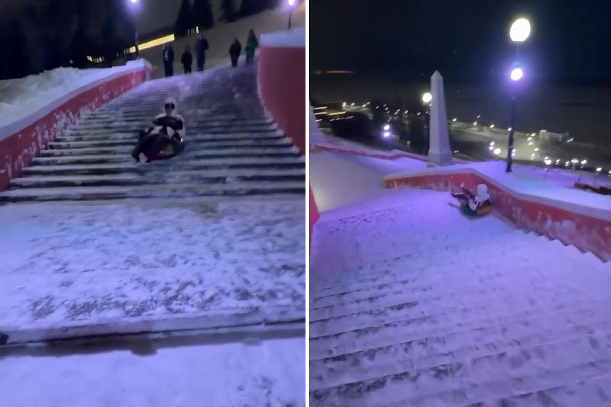 Видеоролик, запечатлевший спуск подростков на ватрушке по Чкаловской лестнице в Нижнем Новгороде, спровоцировал бурную реакцию в интернете. Юноши разместили несколько подобных записей в своих социальных сетях.