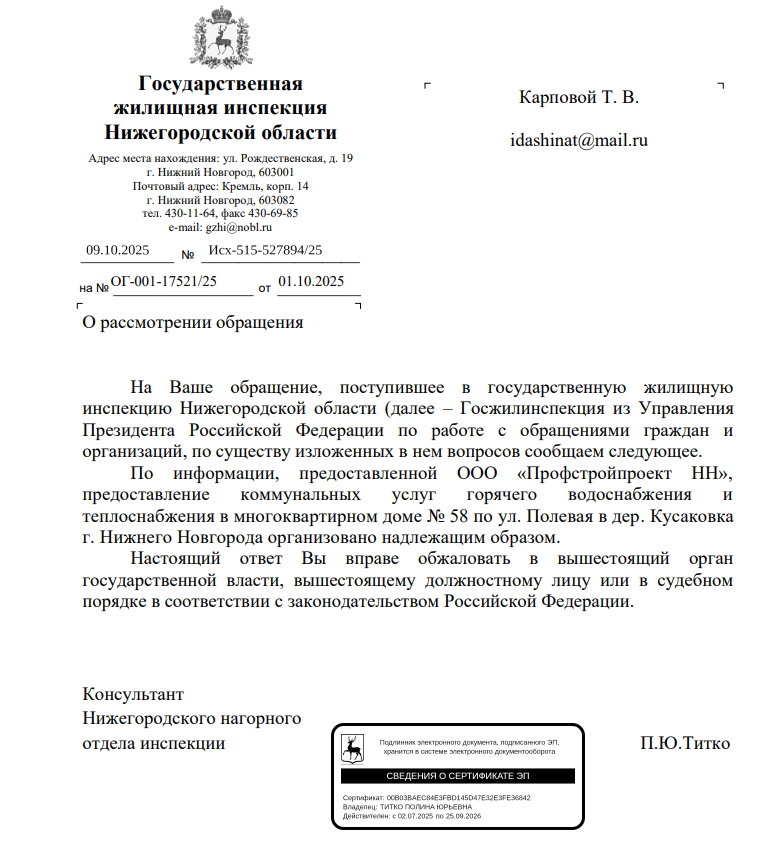 Официальный ответ, полученный жителями от Госжилинспекции.