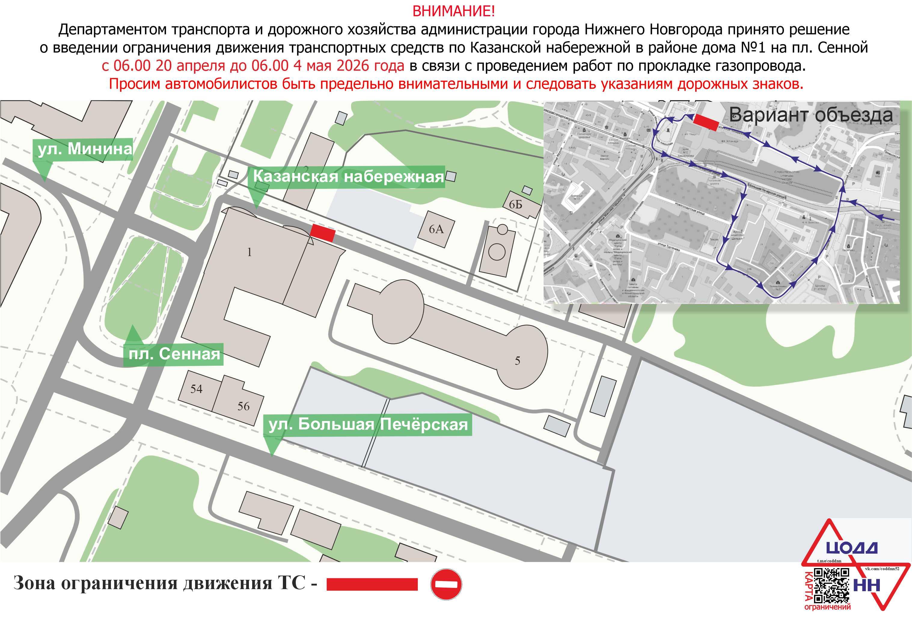 С 6:00 20 апреля до 6:00 4 мая будет полностью перекрыт проезд по Казанской набережной в районе дома №1 на Сенной площади. Причиной ограничений станут ремонтные работы.