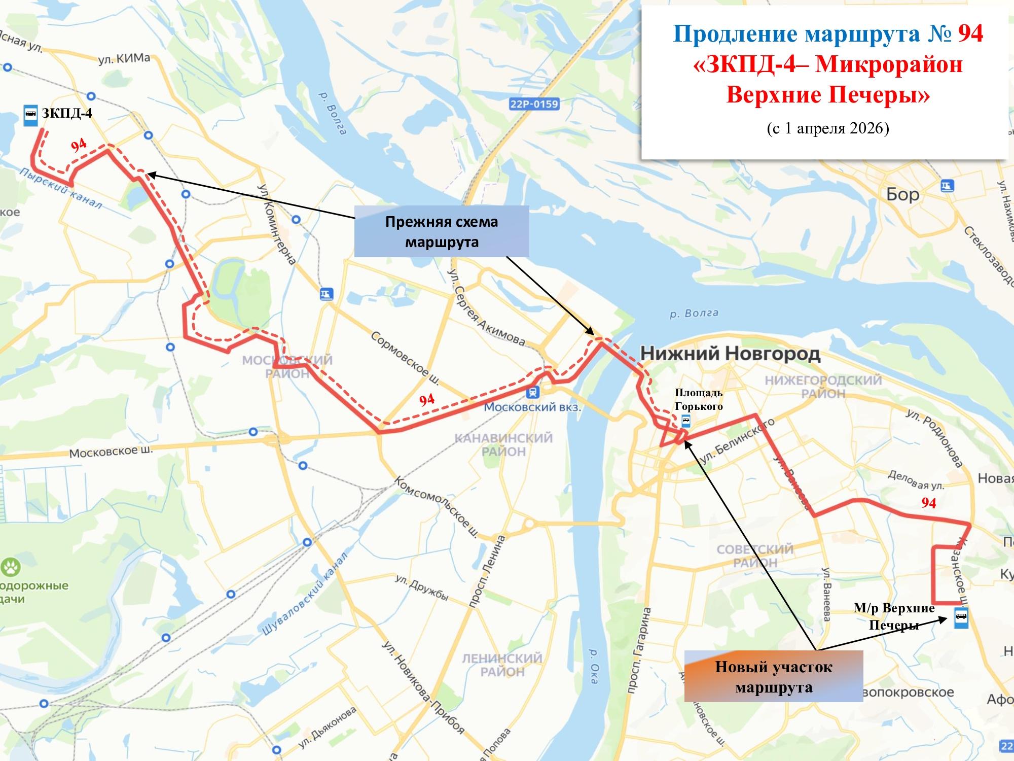Автобусы №94 теперь ходят от ЗКПД-4 до Верхних Печёр вместо площади Горького. «На площади Горького нет отстоя, это существенное ограничение для нормальной деятельности водителей. В то же время поступают жалобы на связку Печеры — Ванеева. … На этом участке работает 61-й маршрут, но он уходит на площадь Минина, Московский вокзал. Мы добавляем наиболее проблемный участок 94-му маршруту, увеличиваем количество автобусов», — объяснил замминистра. Транспортники проверят загруженность маршрута после продления и при необходимости готовы добавить ещё автобусы.