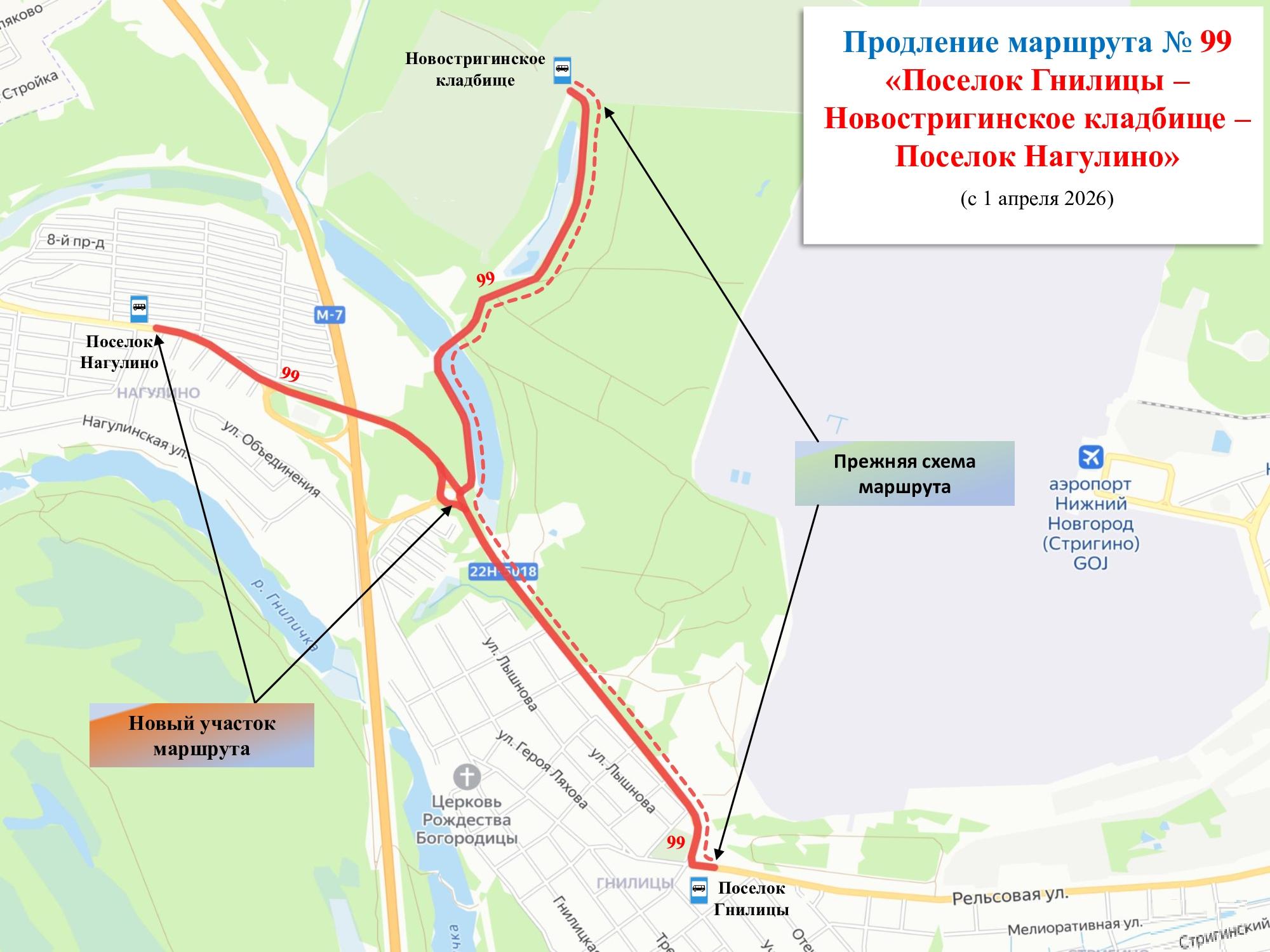 Маршрут №99, который соединяет посёлок Гнилицы и Новостригинское кладбище, теперь включает и посёлок Нагулино. «Жители просили обеспечить им связь посёлка Нагулино с посёлком Гнилицы, где можно пересесть на трамвай. Сейчас 99-й эту связь будет обеспечивать», — сказал Рябинин.