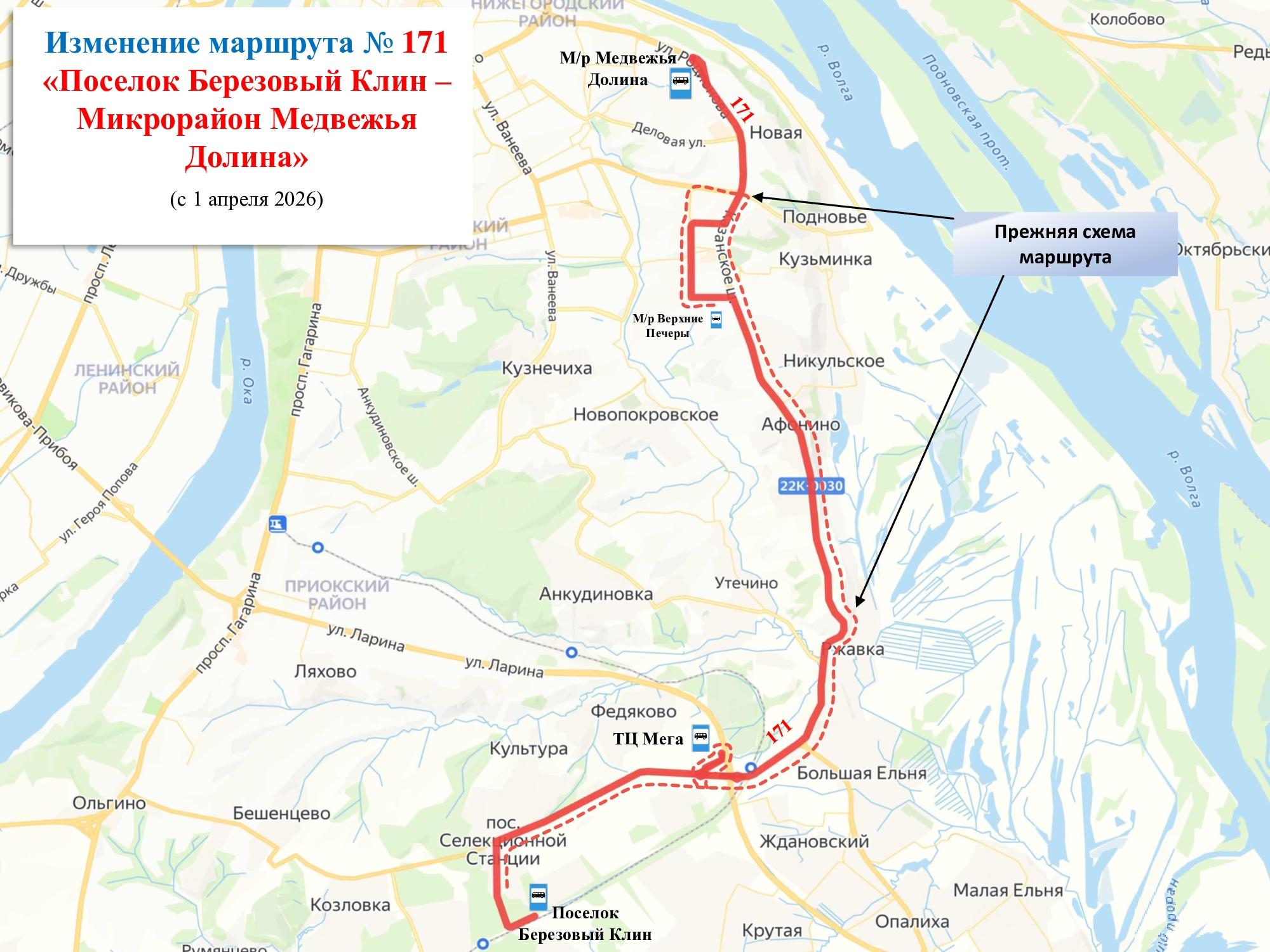 Автобусы №171 продлили от посёлка Берёзовый Клин до остановки «Медвежья долина» вместо Верхних Печёр. Это изменение обеспечит связь с онкологическим диспансером, торговым центром «Фантастика» и МФЦ.