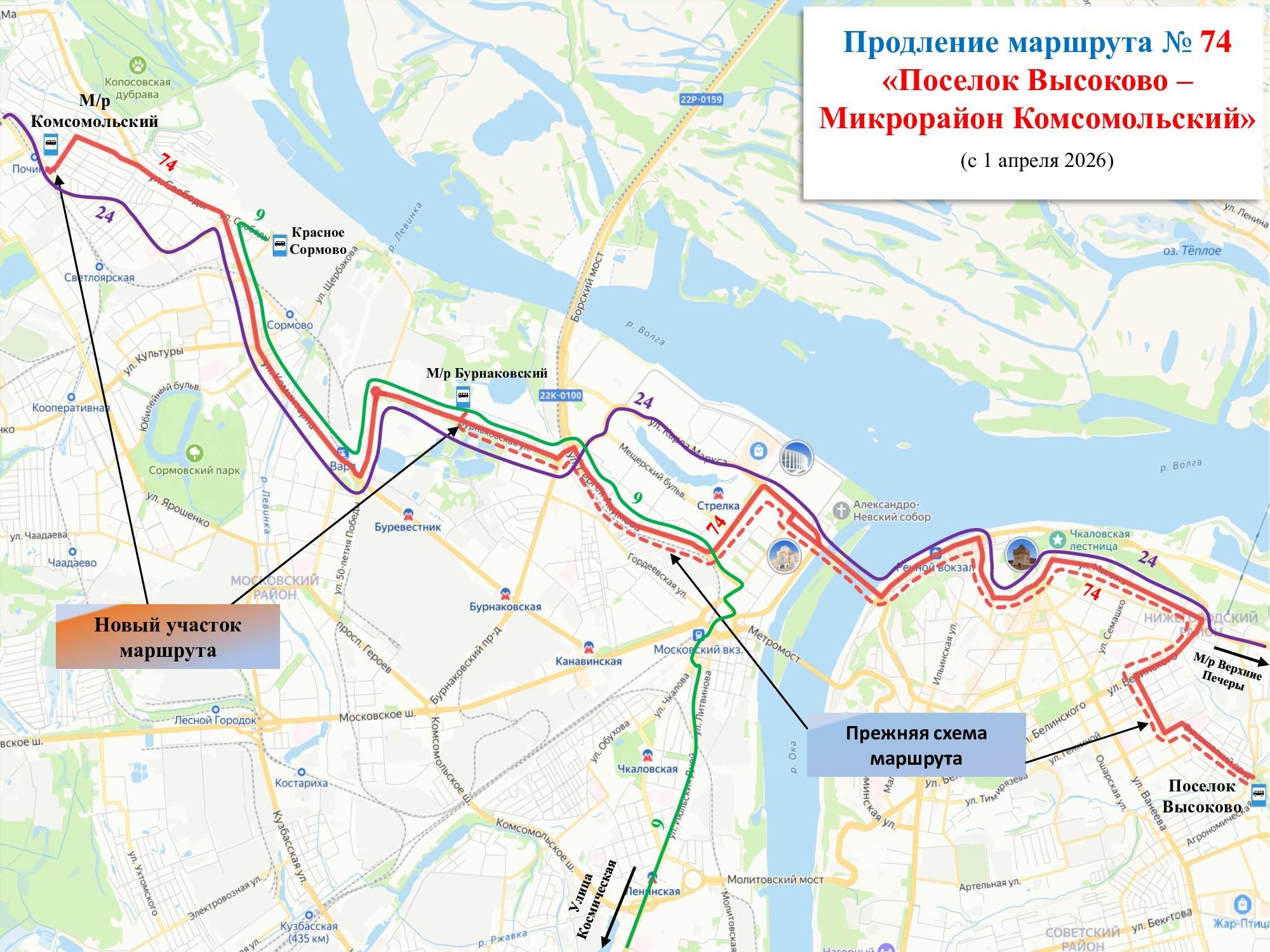 Маршрут №74 теперь связывает посёлок Высоково с микрорайоном «Комсомольский», частично дублируя пути №9 и 24. «Дублирования здесь не происходит, здесь происходит помощь одного маршрута двум соседствующим. У нас очень много жалоб есть на переполненность 24-го маршрута. Жалобы все идут с улицы Карла Маркса», — отметил Рябинин. После центра Сормова маршруты №24 и 74 расходятся: первый сворачивает на Союзный переулок, второй следует по улице Свободы, а их расписание разнесено для избежания следования друг за другом.